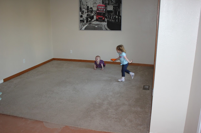 Just for fun I thought I would share this shot of Amelia enjoying the freedom the open kitchen allows. Since we are renovating half of the first floor and the basement, pretty much everything from those spaces is crammed into our carpeted family room and play room. Check out the chaos below: