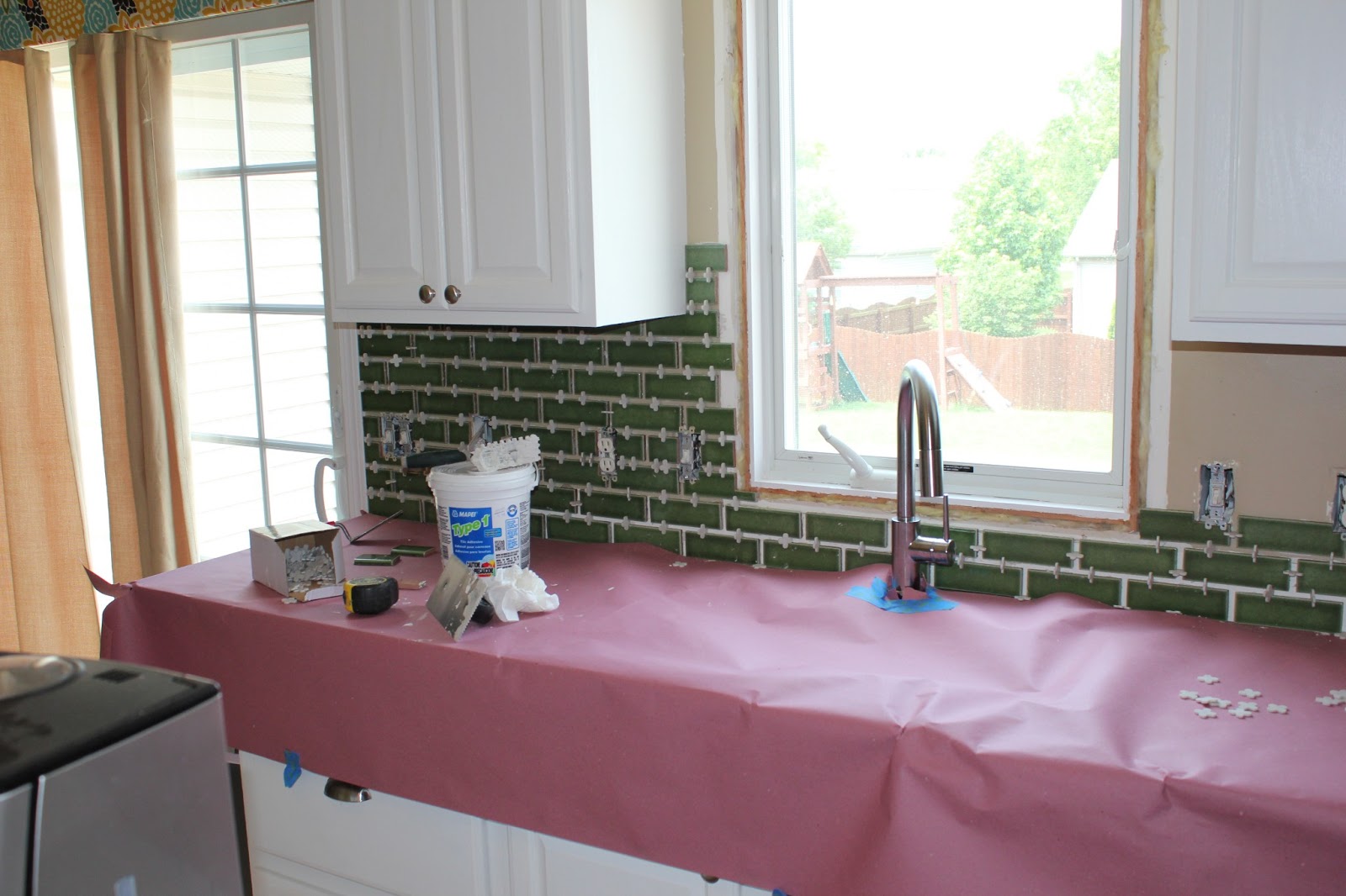 This gives you an almost decent shot of the faucet, but does let you see what is going on today. We ordered the Debris Series Fireclay Tile in the 2x6 size and we are going with a 3/8 inch white grout. It will be a lot of grout, but the tile can be a little dark, so it was important we had the white grout to balance it out. Before we committed and ordered the tile, Matt drew out to scale drawings of each of the different tile sizes and we hung those up on the wall. We actually kept them up for a couple of days before agreeing on the size and placing the order. The Fireclay Tile was definitely a splurge, but in the end we think it will be the biggest part of the renovation that screams us. It's bright, it's fun, and most importantly, it's green!
